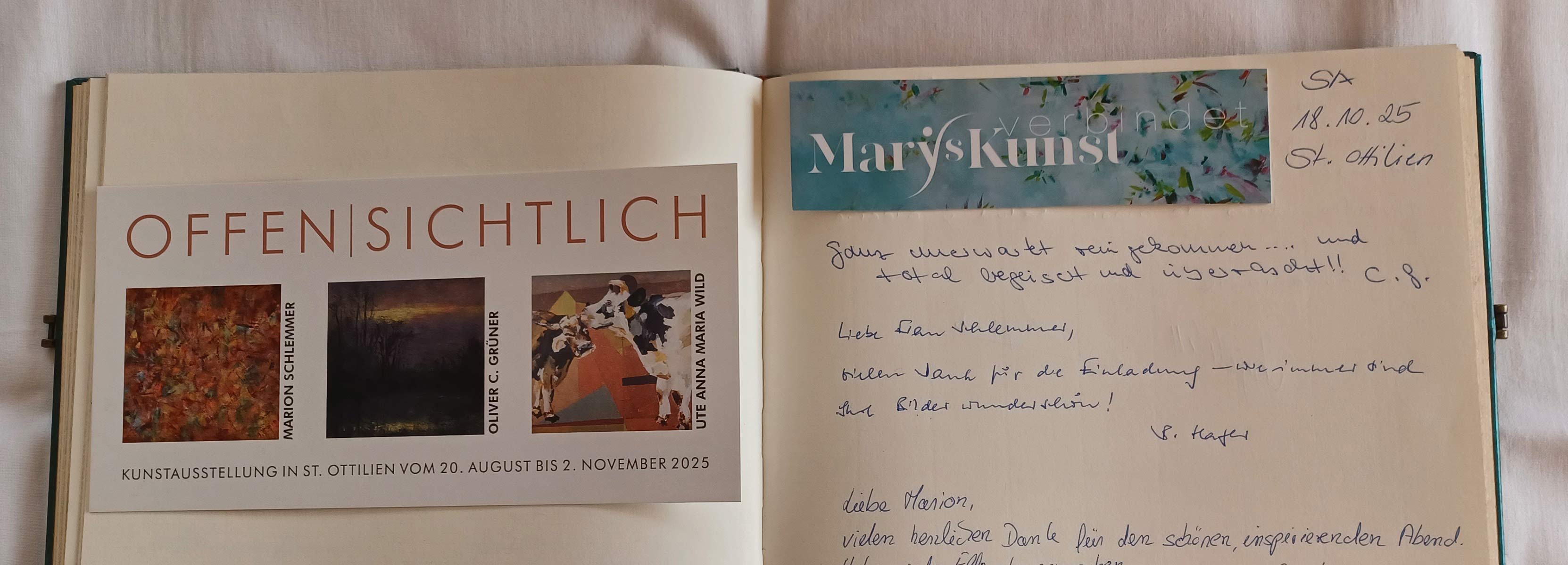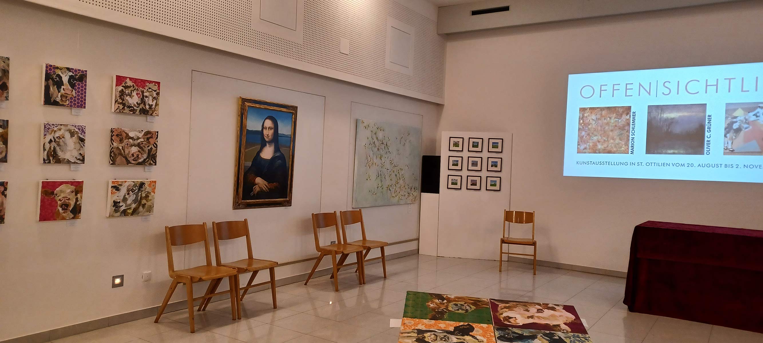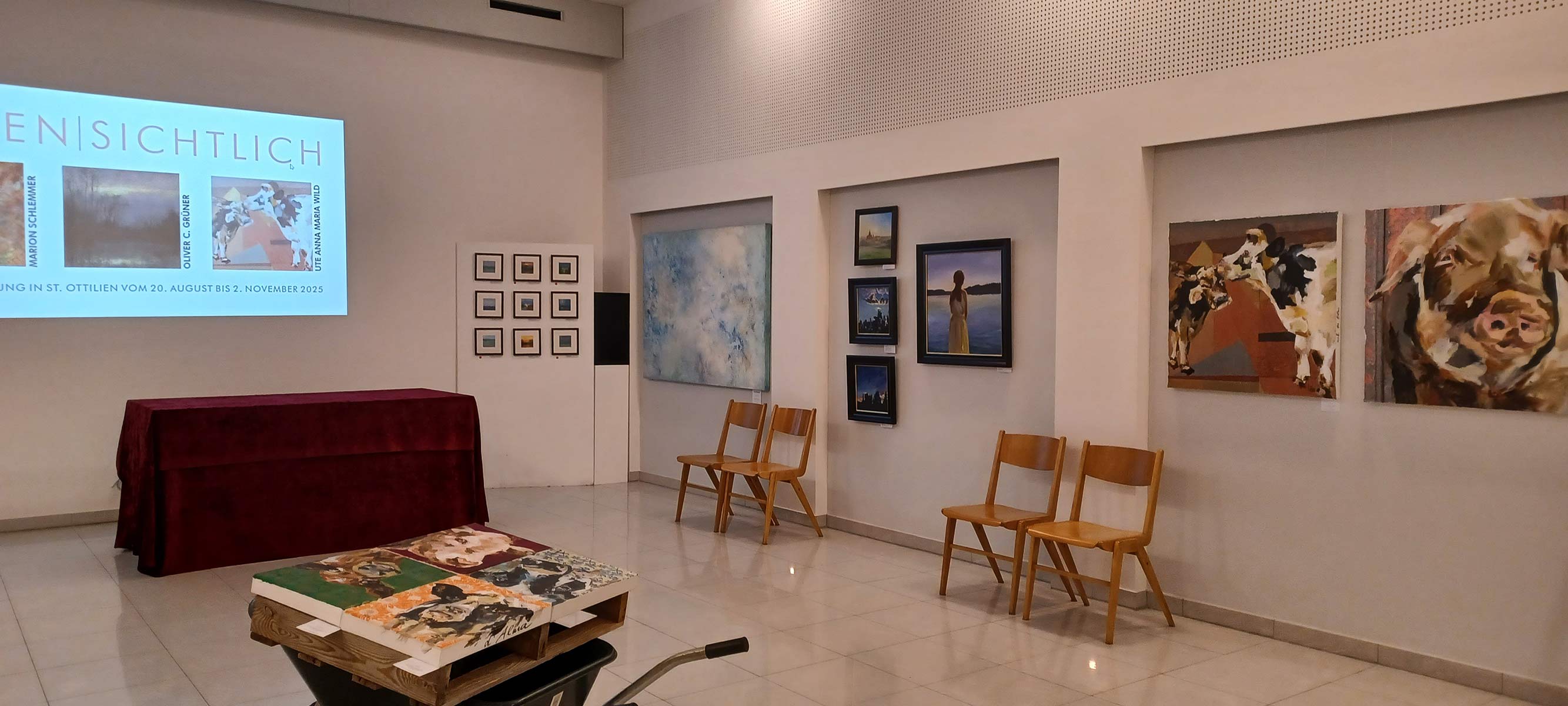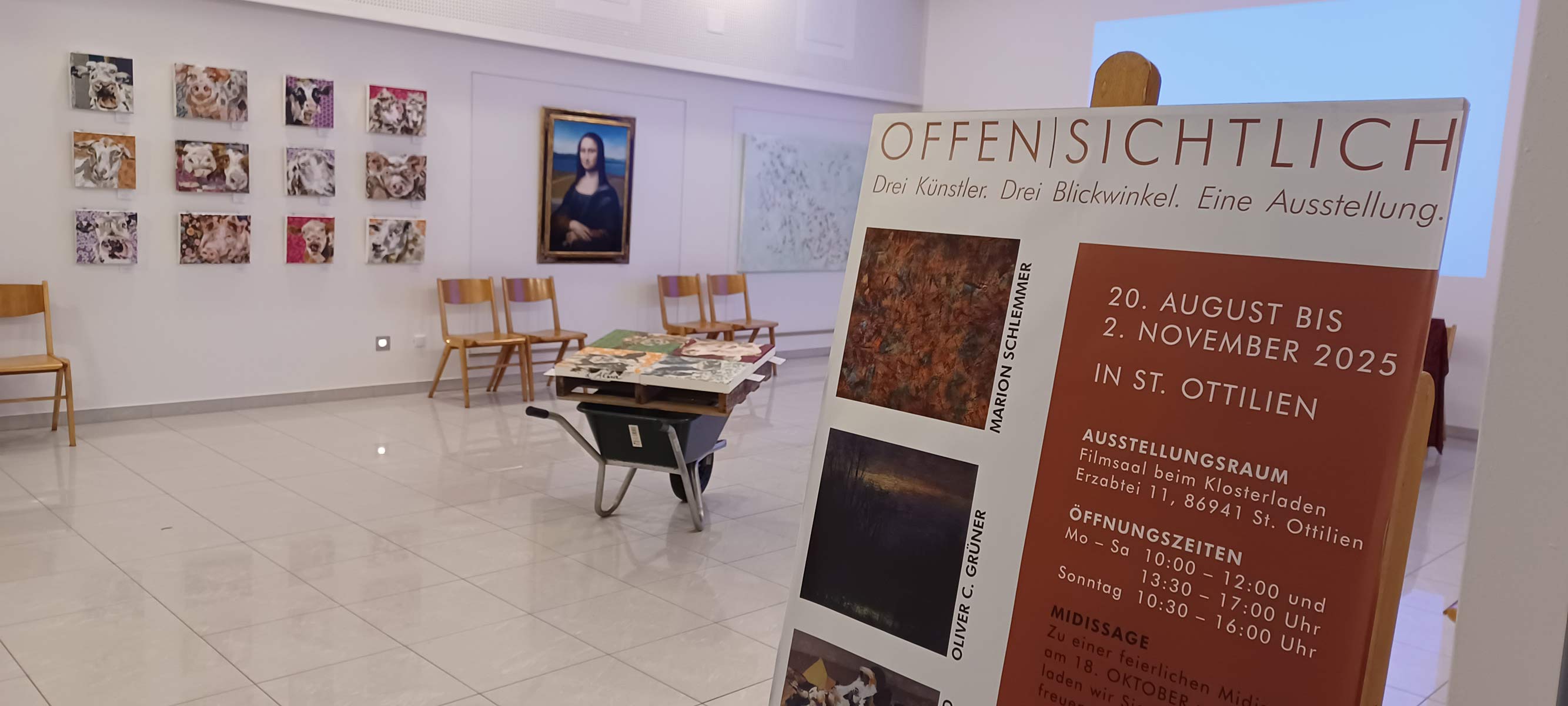 Oktober 2025: Midissage der Kunstausstellung „OFFEN | SICHTLICH“ im Filmsaal St. Ottilien – Werke von Marys Kunst verbindet, Ute Anna Maria Wild und Oliver C. Grüner