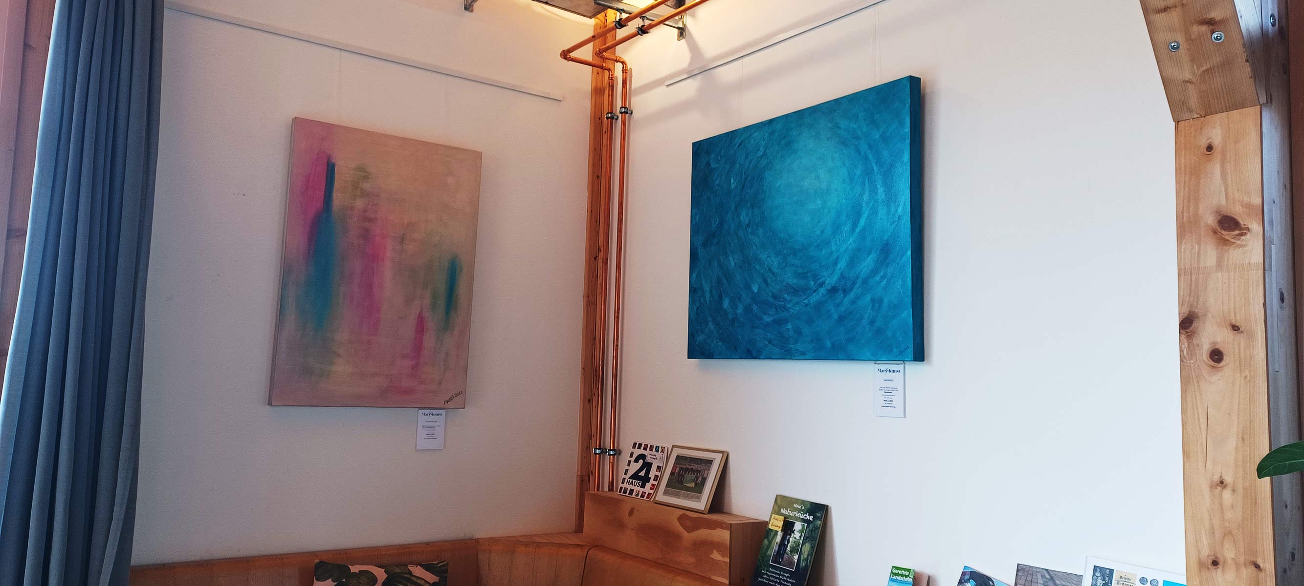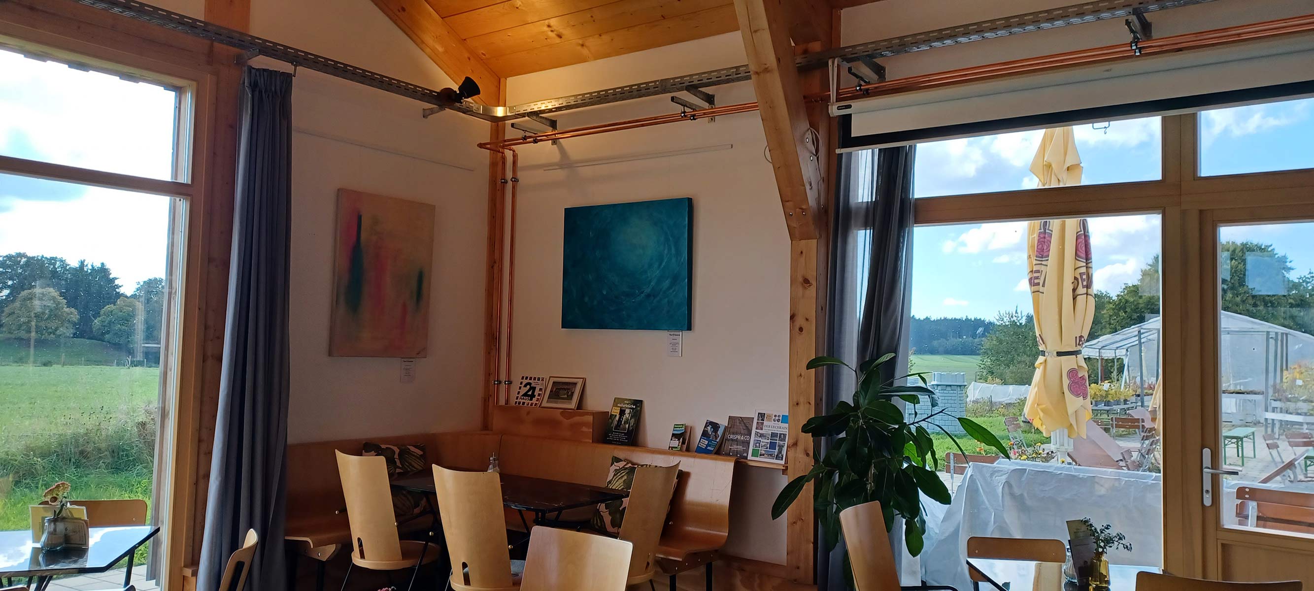 Ein besonderer Ort lädt dazu ein, in meine Arbeiten einzutauchen – in Form, Farbe und Intuition. Im Café Löwenzahn verschmelzen Kunst und Atmosphäre auf wunderbare Weise: Zwischen hausgemachten Kuchen, regionalen Bio-Spezialitäten und dem Blick auf die Alpen kann man die Ausstellung in aller Ruhe entdecken und genießen.