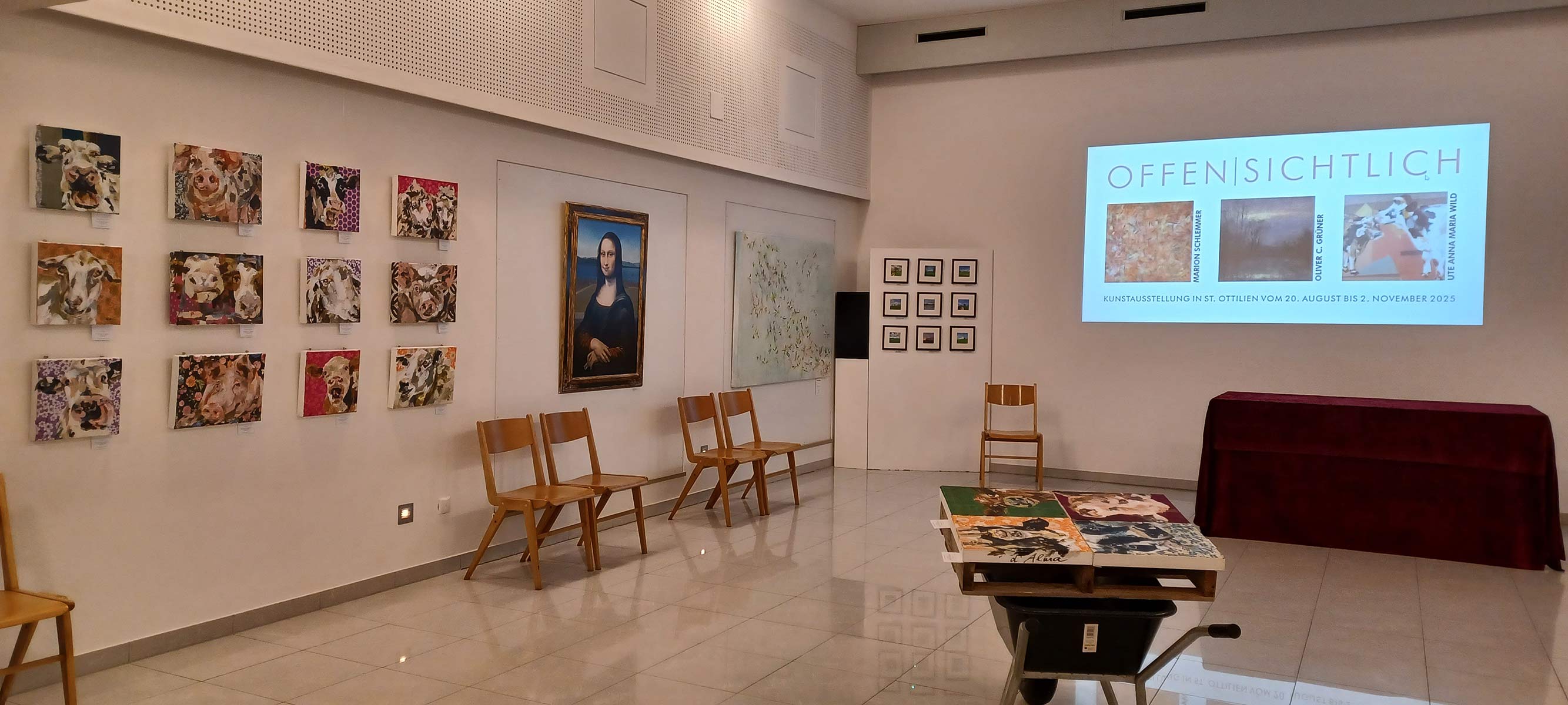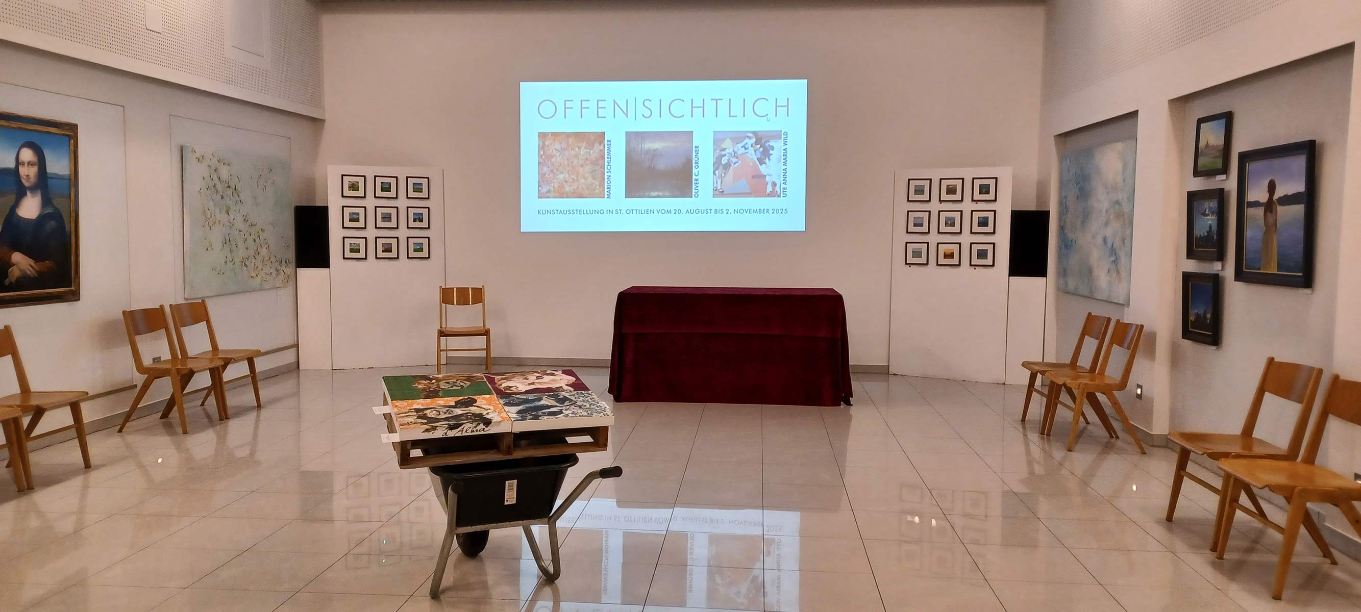 Oktober 2025: Midissage der Kunstausstellung „OFFEN | SICHTLICH“ im Filmsaal St. Ottilien – Werke von Marys Kunst verbindet, Ute Anna Maria Wild und Oliver C. Grüner