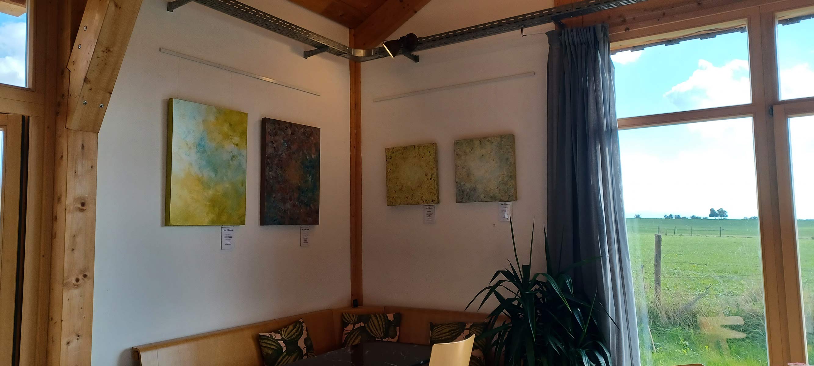 Ein besonderer Ort lädt dazu ein, in meine Arbeiten einzutauchen – in Form, Farbe und Intuition. Im Café Löwenzahn verschmelzen Kunst und Atmosphäre auf wunderbare Weise: Zwischen hausgemachten Kuchen, regionalen Bio-Spezialitäten und dem Blick auf die Alpen kann man die Ausstellung in aller Ruhe entdecken und genießen.